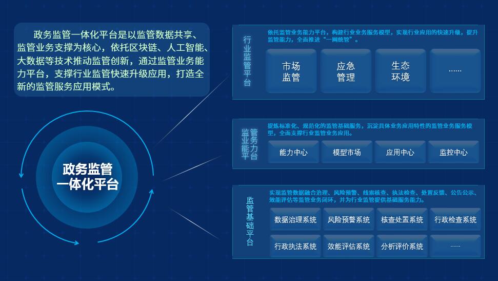 政策背景“互聯(lián)網(wǎng)+監(jiān)管”以監(jiān)管數(shù)據(jù)共享為核心,通過歸集共享各領(lǐng)域的相關(guān)數(shù)據(jù),依托互聯(lián)網(wǎng)、大數(shù)據(jù)技術(shù),運(yùn)用大數(shù)據(jù)等推動(dòng)監(jiān)管創(chuàng)新,實(shí)現(xiàn)及早發(fā)現(xiàn)防范苗頭性和跨行業(yè)跨區(qū)域風(fēng)險(xiǎn);并完善對(duì)各領(lǐng)域生產(chǎn)經(jīng)營(yíng)的事前事中事后監(jiān)管,加強(qiáng)和創(chuàng)新“雙隨機(jī)、一…