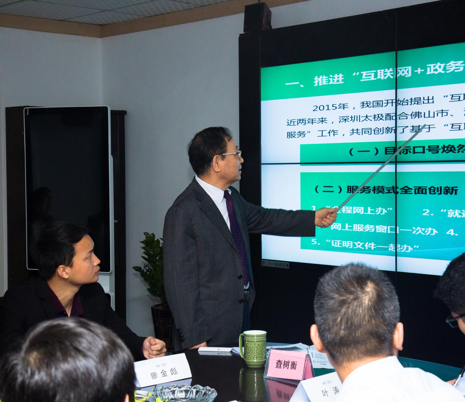 4月11日下午,貴陽市烏當(dāng)區(qū)政務(wù)服務(wù)中心主任唐潔、辦公室主任唐繼英、業(yè)務(wù)室主任張華海一行來我司參觀考察。 查樹衡董事長熱情接待了來訪嘉賓。查總向唐潔主任一行詳細(xì)介紹了近幾年來深圳太極在“互聯(lián)網(wǎng)+政務(wù)服務(wù)”建設(shè)方面積累的成功經(jīng)驗(yàn),并…